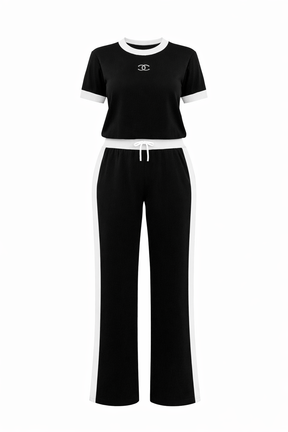 Eleva tu look casual con nuestro Set Deportivo, una propuesta cómoda, moderna y sofisticada. Compuesto por camiseta negra con detalles blancos en cuello y mangas, y pantalón a juego con franjas laterales que estilizan la silueta.